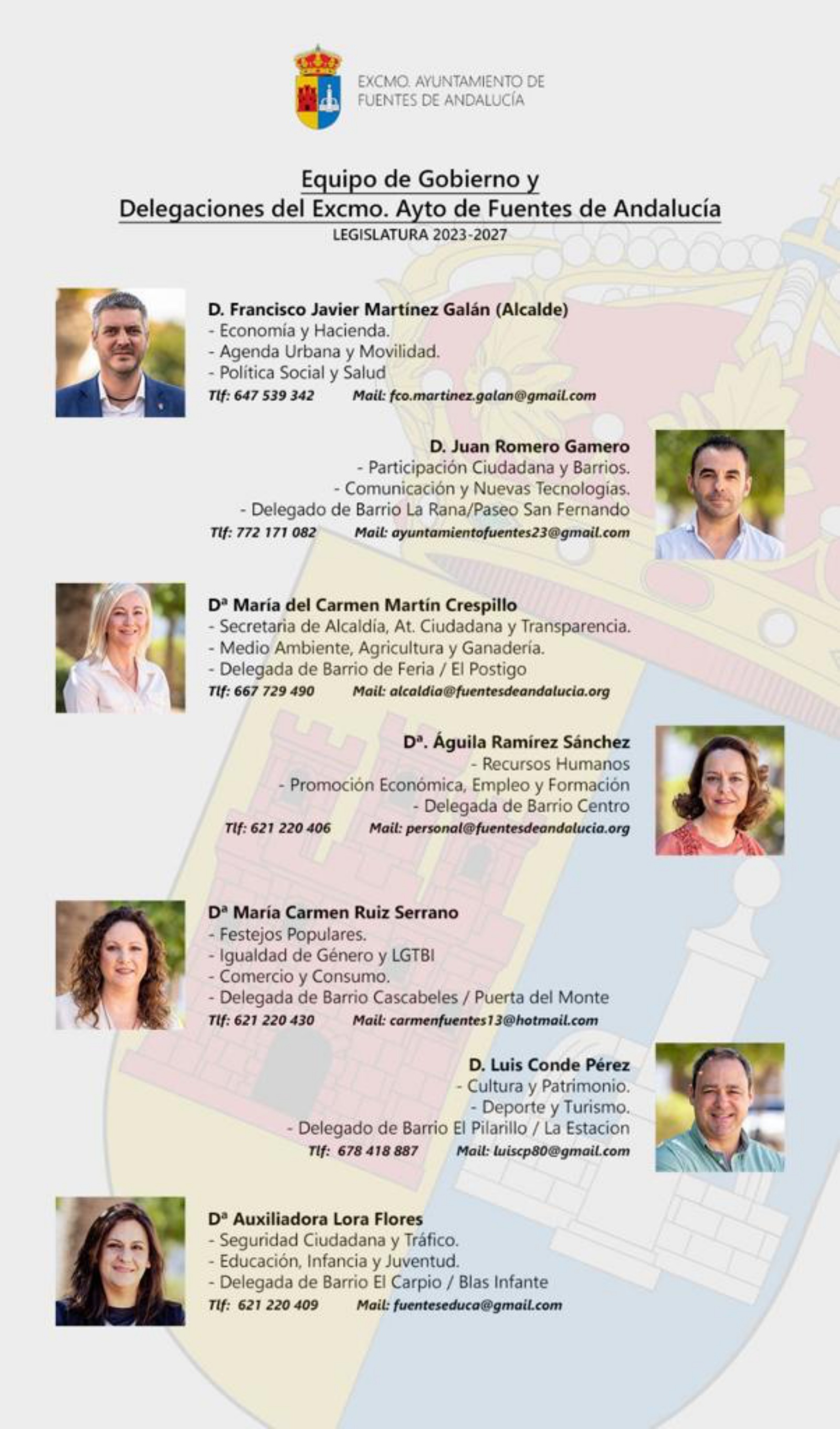 Juan Romero es el nuevo delegado de Participación Ciudadana, Barrios, Comunicación y Nuevas Tecnologías. Nuevo en el ayuntamiento, el maestro Romero es el único concejal del equipo de gobierno que no tendrá sueldo municipal porque prefiere seguir en su puesto de técnico del CEP de Lora del Río. Mari Carmen Martín Crespillo sigue en la Secretaría del Alcalde, Medio Ambiente, Agricultura y Ganadería. Recibe la nueva tarea de Atención Ciudadana y Transparencia. Ante el vecindario, Martín Crespillo ejerce de "puerta de entrada" al ayuntamiento.