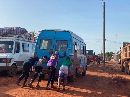 Pese a que las gasolineras no tienen combustible que vender, la carretera de Bissau, la capital del país, nos recibe con un atasco descomunal. Tardamos 6 horas en recorrer 160 kilómetros, a una media de 26,6 kilómetros por hora. ¿De dónde sale el combustible? Los coches y camiones que transitan la única carretera "asfaltada" del país se mueven como si estuviesen atrapados en una tempestad de alta mar. Baches como bocas del metro los engulle y vomita durante kilómetros y kilómetros. Los arcenes de la carretera están llenos de vehículos que no han sobrevivido a la batidora. Este país es un matadero de coches y camiones y, sin embargo, infinidad de ellos siguen arrastrando su chatarra como cucarachas agonizantes. Milagro.