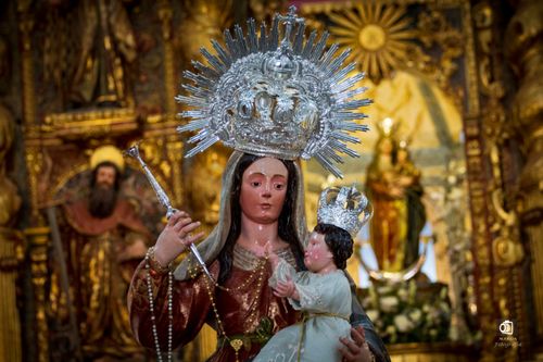 Octubre está marcado a fuego en la piel inocente de la adolescencia fontaniega. Tiempo de devoción "rosariera", mitad misterio, mitad miedo, magia y confesionario. Dos Avemarías y un Padre Nuestro contra la tentación de los tocamientos impuros. Azul de verano azul tardío en dos pueblos de tradición mariana compartida, Fuentes y Marchena, Marchena y Fuentes. Rosario de la Aurora y Virgen del Rosario. Aunque no es sabida con exactitud la fecha de la concesión del patronazgo a la Santísima Virgen del Rosario, los fontaniegos sabemos de la presencia de esta devoción en la localidad desde al menos el siglo XVI. La talla es una obra anónima, posiblemente del siglo XVIII. Debido a su gran paralelismo con la sevillana Virgen del Rosario de los Humeros, se puede considerar que es obra de Jerónimo Roldán, aunque la autoría de esta imagen también plantea serios interrogantes.